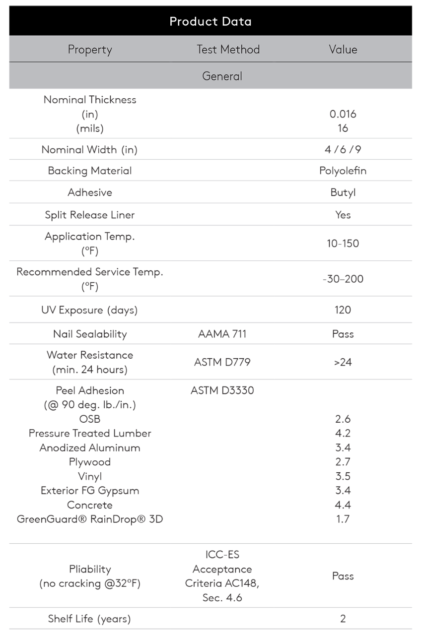 It is available in straight or stretchable alternatives. It provides high-performance water resistance for walls. It adheres across a full range of installation temperatures including lower temperatures, ensuring effectiveness in most climates, and it conforms well to irregular surfaces, eliminating gaps that could create water canals.