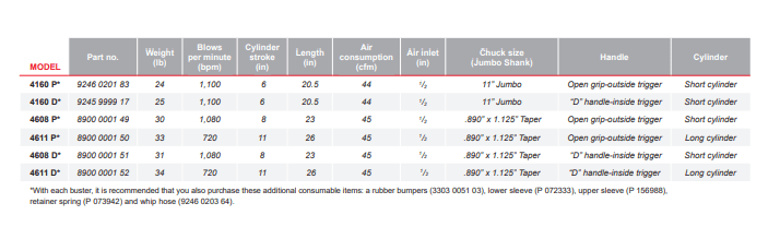 It has a low frequency blow with hitting power equivalent to a paving breaker twice its weight. The new CPS includes a stepped piston and step cylinder to prevent accidental ejection of the piston. Models included in this section: 4160 P*, 4160 D", 4608 P*, 4608 D*, 4611 P*, 4611 D*