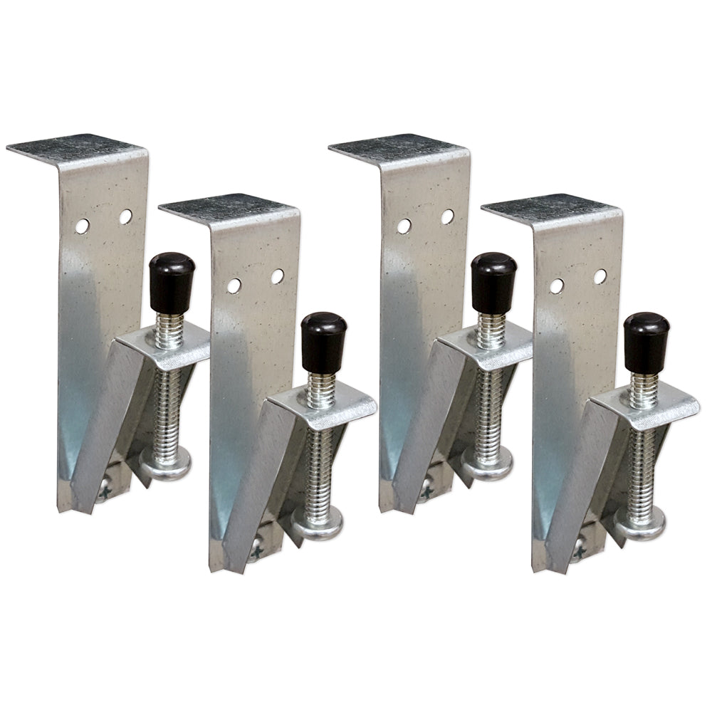 These E-Brackets hang over cabinet divider for strength and are adjustable to accommodate different situations. Only one screw is needed to hold the E-Bracket in place. The E-Brackets are great for mounting stainless steel and porcelain sinks under thin material or any time sink clearance is at a minimum!