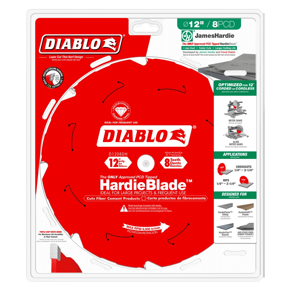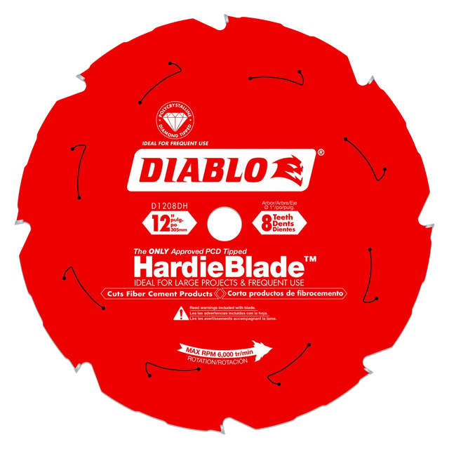Diablo HardieBlade™ is the only approved PCD (PolyCrystalline Diamond) tipped fiber cement blade recommended by James Hardie Building Products. Diablo Fiber Cement Blades generate up to 50% less respirable dust*, while delivering the longest life in all fiber cement materials. Diablo PCD Hardieblades feature a unique, spark-eroded Triple Chip grind for long life – up to 75 times the life in fiber cement of conventional carbide blades Diablo PCD Hardieblades are perfect for full time use in heavy duty applications like cutting multiple pieces of fiber cement board. * Dust generation does not necessarily correlate directly to exposure risk.