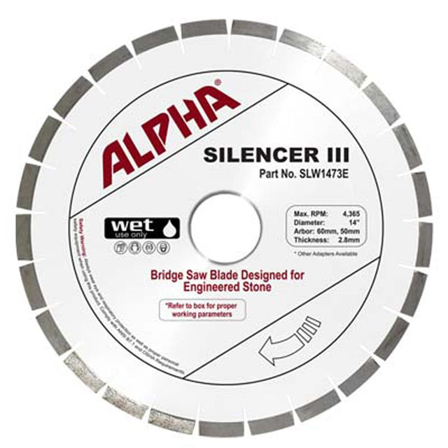 Alpha Professional Tools® recognizes the need for a high-quality engineered stone blade for bridge or table saws and brings this to the marketplace in the form of the Alpha® Silencer III for Engineered Stone. The Alpha® Silencer III is a technologically advanced blade that produces excellent cuts while achieving superior cost performance with reduced noise levels. Ideal for use in a variety of different sized shops, engineered stone fabricators will love the cutting ability of this blade and the amount of time they'll save. The Alpha® Silencer III is equipped with a 60mm arbor which is a common size. Adapters are available to reduce the arbor size. Specially formulated, the Alpha® Silencer III will provide excellent cost performance and reduce noise levels while maintaining a high-quality cut. If you fabricate engineered stone, the Alpha® Silencer III is perfect for you.