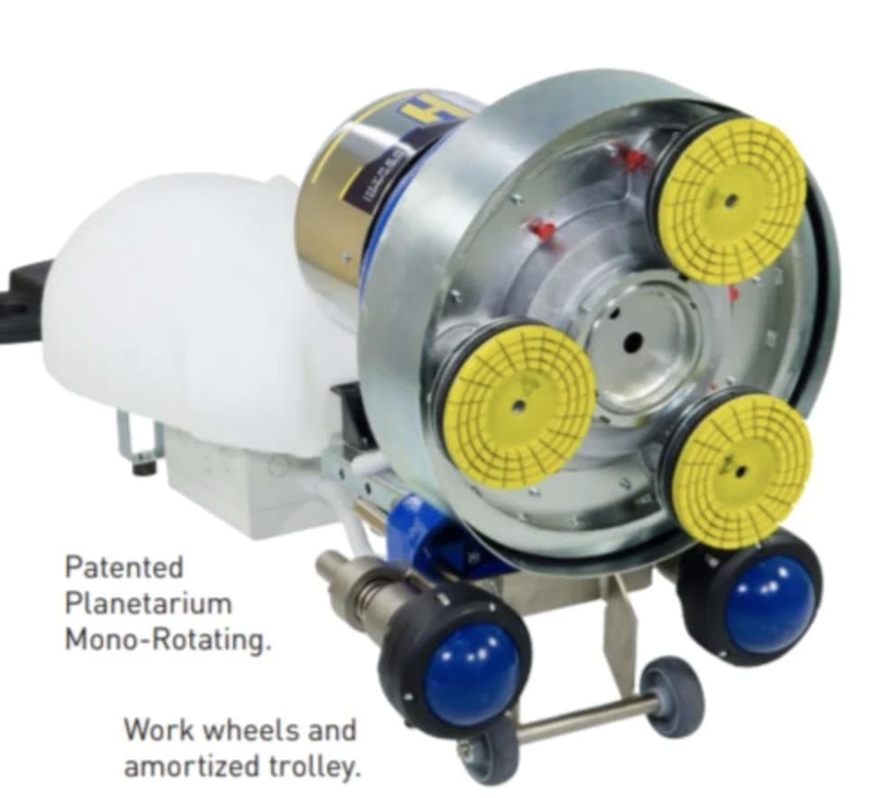HG Hyperlevi 645 VS Top Machine is a multi-functional, incredibly versatile and powerful single-phase grinder. The planetary gear H1200 with three 5.5 inch tools guarantees speed of excision and the best finish even in tight spaces. The H1200 Planetarium is equipped with elastic couplings on each disc, guaranteeing maximum reliability even on the most rough floors. The H1200 Planetarium is released in a few seconds to give place to brushes or draggers for abrasive discs, 17 inches in diameter, widening the fields of use.