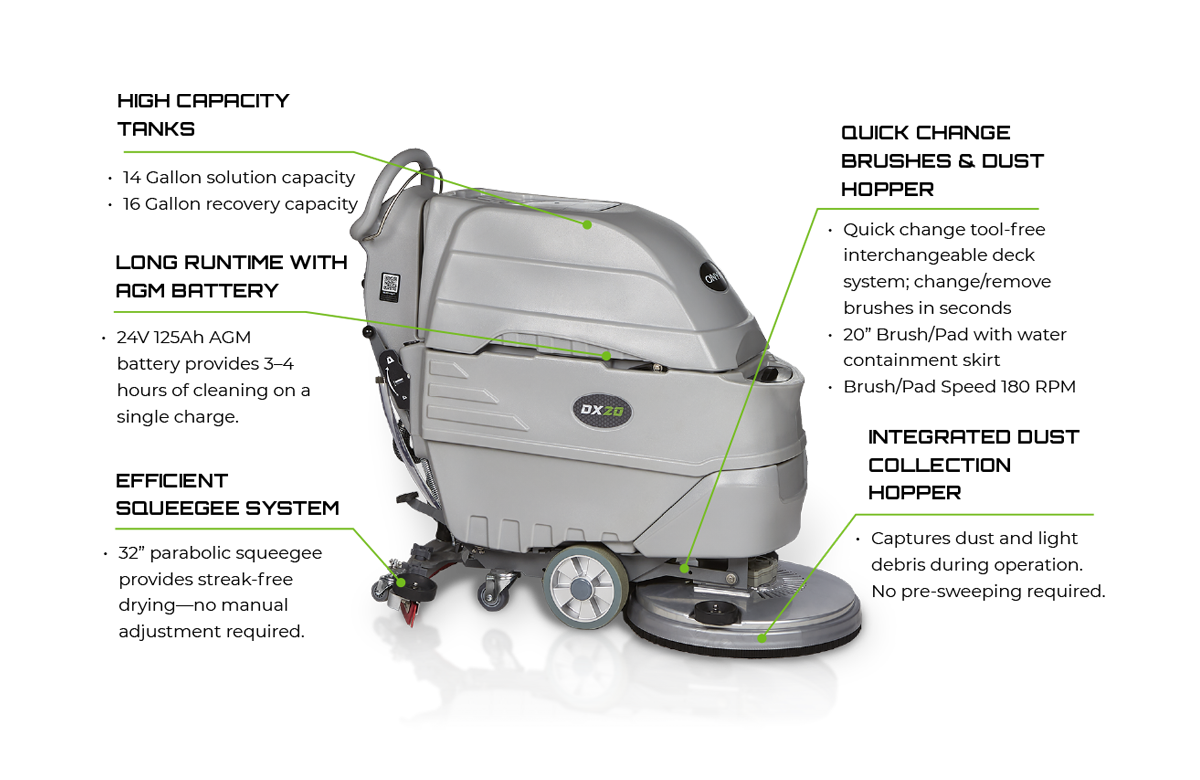 The DX20 is a powerful walk-behind pad assist driven floor scrubber dryer engineered for deep cleaning performance in high-demand commercial and industrial settings. Featuring a rugged cast aluminum 20" cleaning head and a high-capacity tank system, it delivers unmatched cleaning results with productivity rates of up to 24,000 sq. ft. per hour.