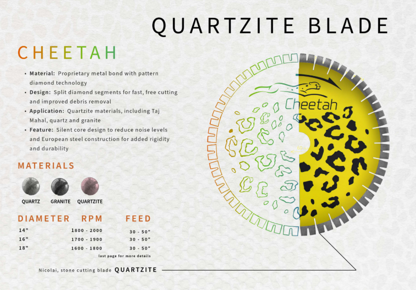 The Nicolai Cheetah Quartzite was designed to quickly and cleanly cut through the extremely hard and dense crystalline structure of quartzite materials, including Taj Mahal.