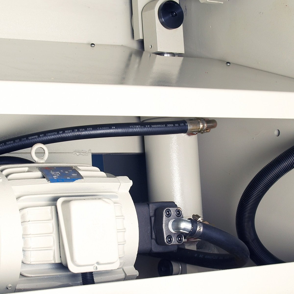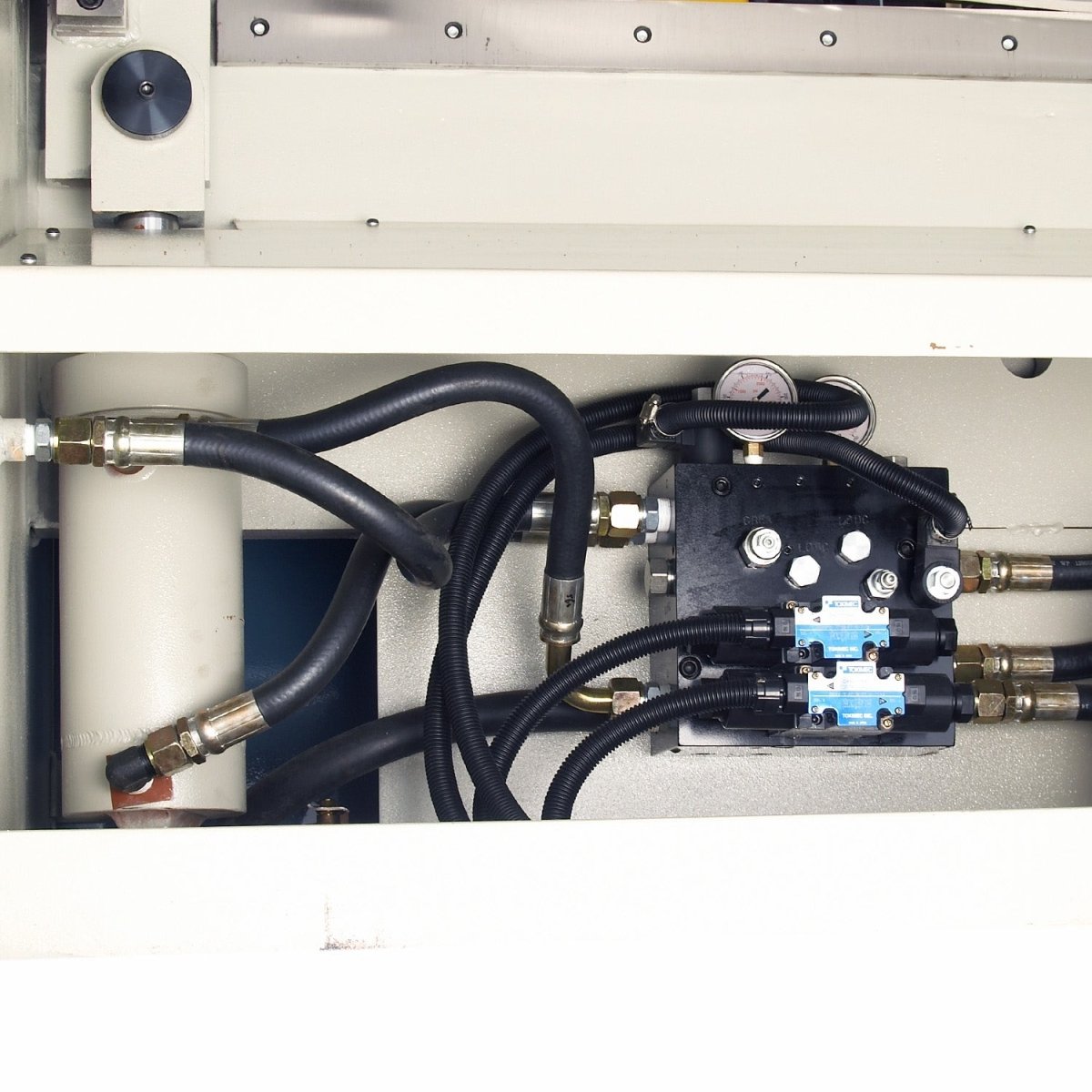 - Hydraulic hold-downs clamp the sheet solidly to the table, eliminating material lifting and improving blade life.