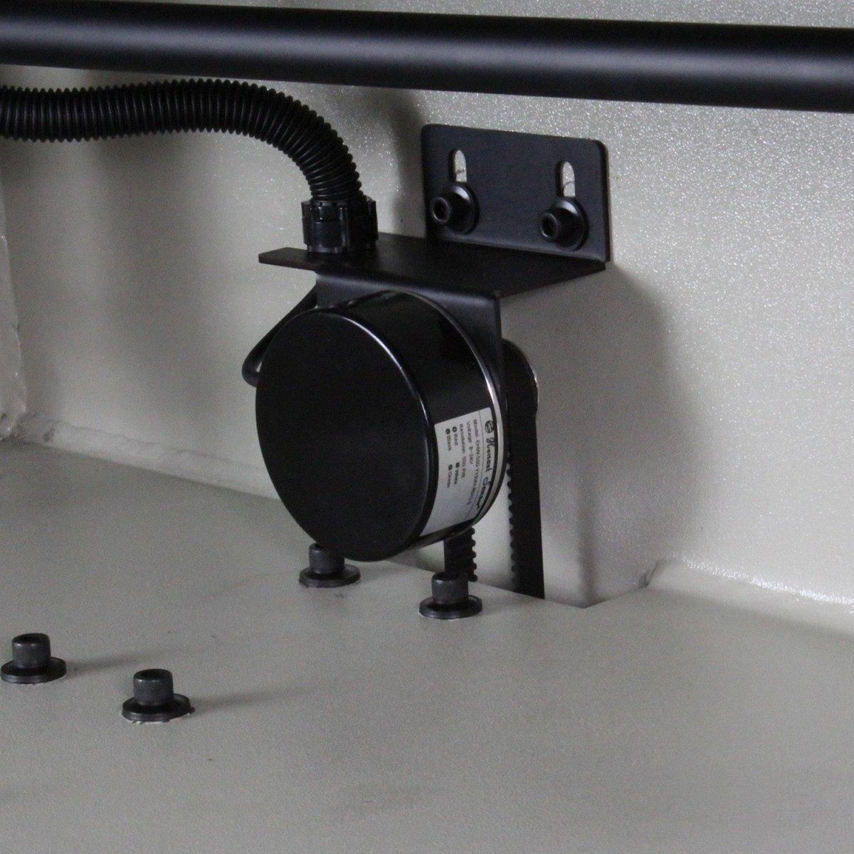 - Programmable quick-change backgauge rides on a screwball rail system with a positioning encoder.
