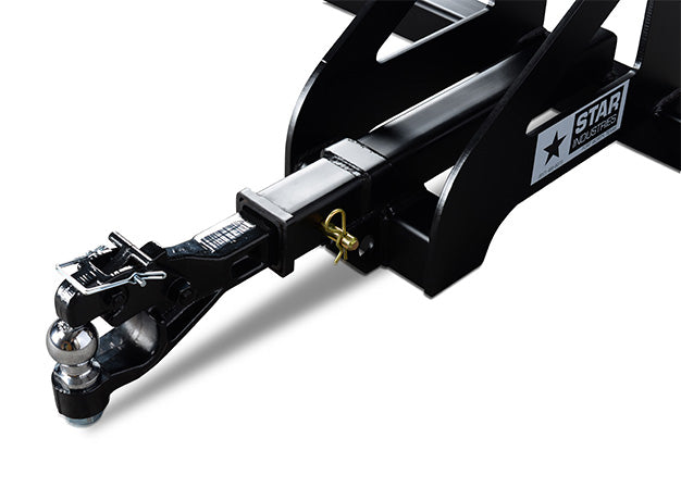 The trailer spotter attaches to the skid steer with a hitch receiver ball, pintle hitch, or combo hitch facing outwards. This allows the operator to attach trailers and equipment with hitch attachments to the skid steer, making maneuvering around the rental yard or construction site easy.