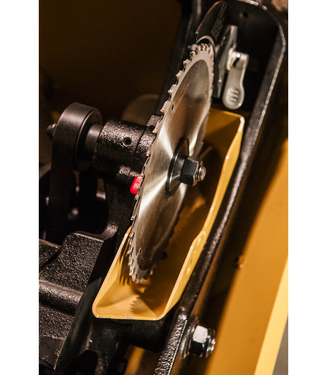 The cast iron tables are oversized, and the newly designed arbor lock lever is accessible from above the table top to eliminate the need for dual arbor wrenches. The quick-release riving knife design helps reduce the chance of kickback. The blade tilt scale features an integrated digital read out as well as adjustable angle indicators for repetitive bevel cuts. The newly designed integrated retractable hydraulic caster system mobilizes your table saw much higher than the previous model to assist when moving over thresholds. A wide stance, heavy-duty box trunnion and concave teeth on the trunnion gears promote easier raising and tilting of saw blade. Poly-V drive belt system results in quieter, more efficient power transfer from the motor to the arbor with virtually no vibration and less heat build-up. Improved built-in dust collection port with convenient access to the inside of the saw cabinet for simple clean-up. The saw has a proprietary safety switch with magnetic interlock and the stop button can be knee activated.