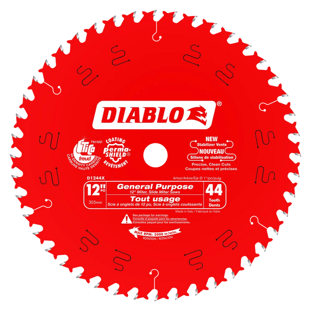 Diablo's general purpose blade is ideal for cutting oak, pine, plywood, pressure treated lumber and beams. An excellent choice for table & miter saws, Diablo's blade leaves a smooth cut in a variety of applications, reducing the need to change blades between tasks. Use it for rip cuts with a smoother finish than dedicated ripping blades, or make quality crosscuts in solid wood or plywood. Great for both sliding and “chop” style miter saws as well as table saws.