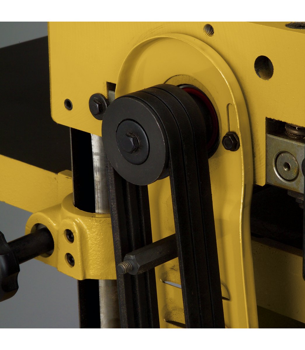 Three V-belts transfer maximum power from the 3HP motor to the cutterhead. Your workpiece will get substantial support from the precision ground cast iron table and two large extension wings. The 4" dust port angles the collection hose away from the work area. Stock return rollers atop the machine speed repetitive cuts. The serrated steel infeed and smooth steel outfeed roller allow for 1/8" maximum depth of cut and trouble-free operation. A 2-speed gearbox features an automatic chain tensioner. The one-piece welded steel stand has built-in lockable casters for easy movement around the shop.