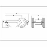 Large trolley with pneumatic back wheels. Vulcanized rubber on the bottom, sides, and top of the support plate to avoid chipping the edges of finished workpieces.