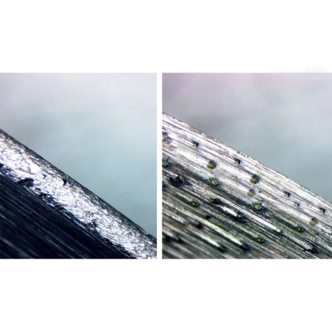 Any diamond blade may get dull and lose its cutting features. It occurs especially often while cutting such non-abrasive solid, viscous materials as porcelain gres, marble, non-abrasive ceramics, etc. Diamond grains destroy and drop out, the processed material has stuck to the bonds surface. Temperature increases in the contact point, cutting quality decreases and the blade stops. There is a risk of damaging your tool. The blade should be sharpened. To sharpen means to make several cuts on the abrasive material.