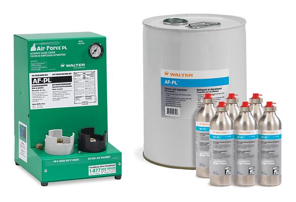 AF-PL is a system with a base unit that automatically dispenses AF-PL liquid cleaner and compressed air into refillable spray cans. Save money by buying your cleaner in bulk and reduce costs associated with the disposal of aerosol cans, all while reducing your environmental impact. - The kit includes the use of an Air Force PL station.