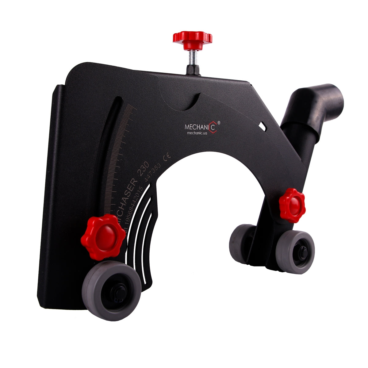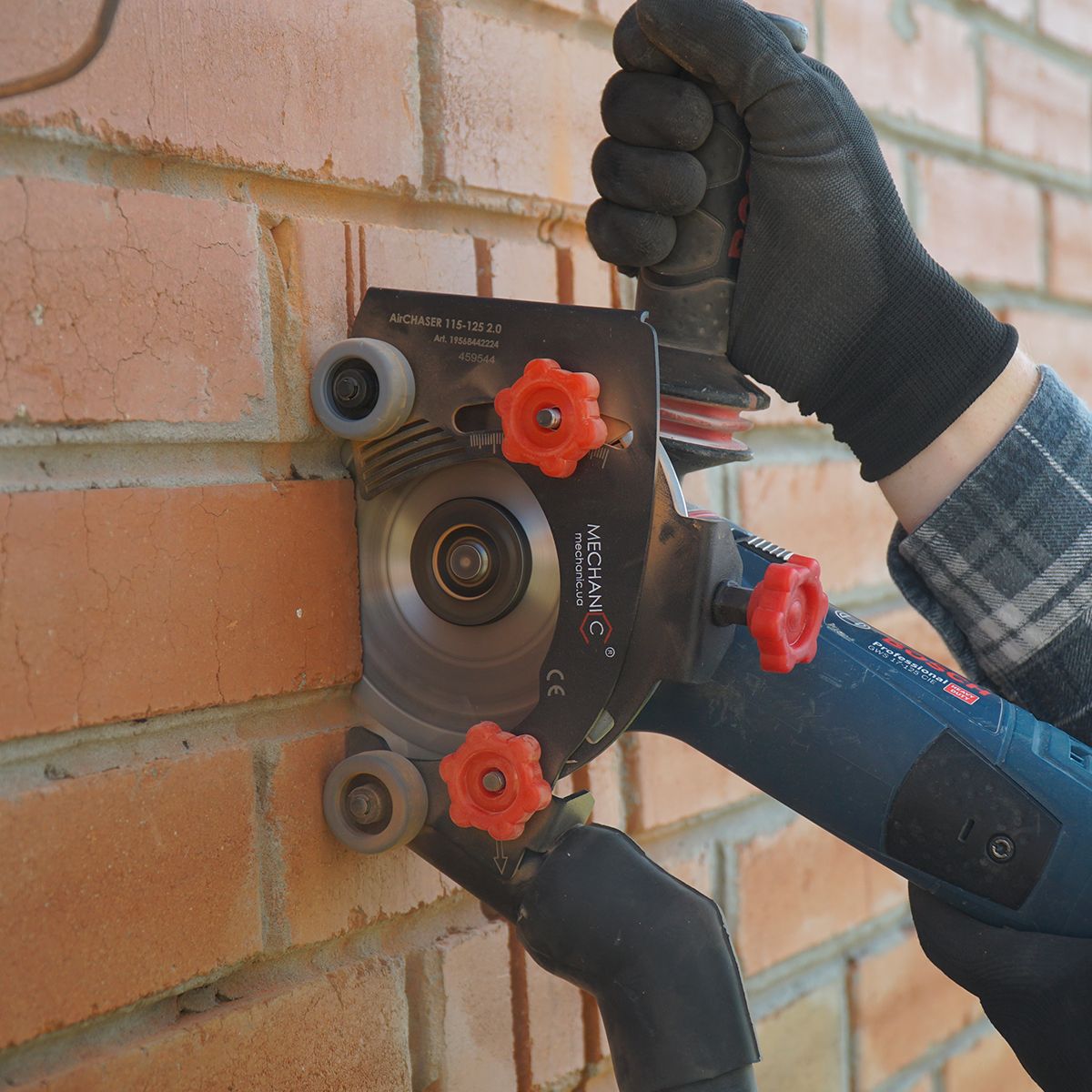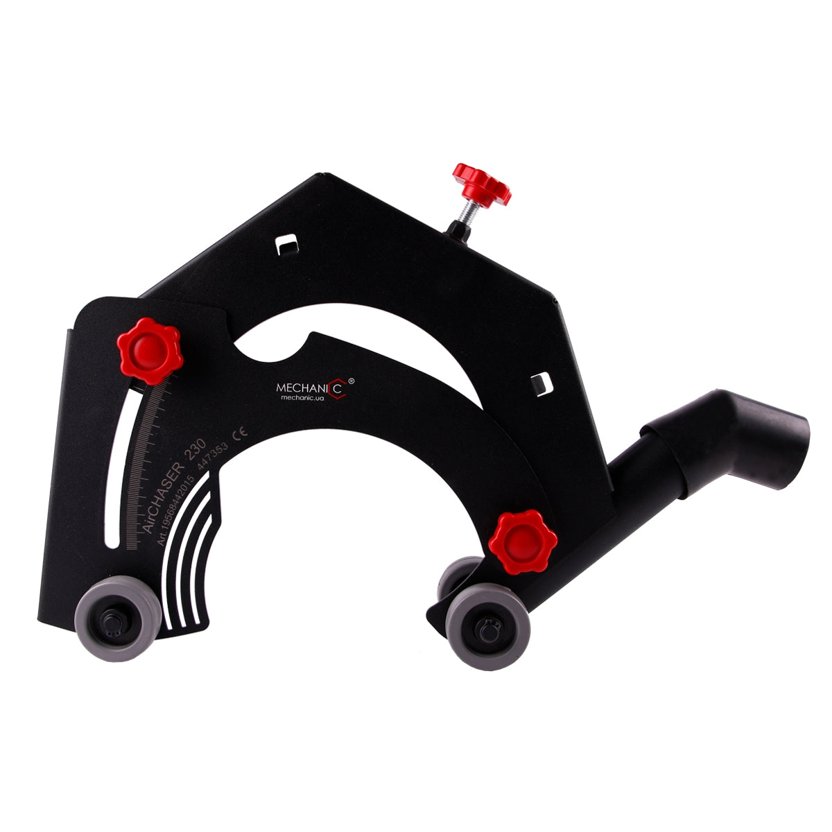 The AirCHASER is designed for cutting strobe for electrical wiring, water supply, sewage in concrete, brick and other surfaces. Adjust the depth and cut without dust! - The universal mounting system allows easily install the accessory attachment on the angle grinder of any model and any manufacturer - It has an adjustable cutting depth - Plastic wheels ensure smooth movement on the surface - Aerodynamic system and brush seal effectively remove dust from the cutting area - Open design provides a full view of the cutting zone, cooling the blade - Lightweight in comparison with the existing wall chaser machines - Strong metal and stiffening ribs make the structure rigid and reliable., - The rubber tube allows to connect vacuum cleaners from various manufacturers.