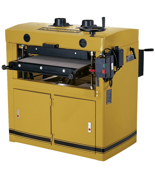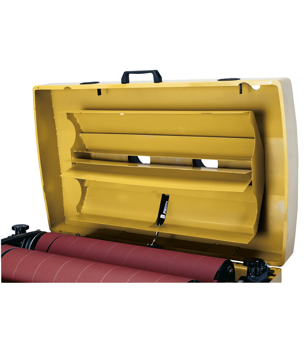 The dual steel drums have a hard durometer rubber coating to assure a flat, mar free finish. Independently adjustable rear drum makes fine tuning easy. A heavy cast iron table incorporates four solid jackscrews with chain drive timing to keep it level at all times. The heavy-duty poly conveyor belt provides a positive grip on the stock. The 1/4HP feed motor is coupled to a two-speed forward/reverse gearbox that will sand 8 and 12 surface feet per minute. The heavy steel cabinet provides years of vibration free sanding, with plenty of storage space underneath.