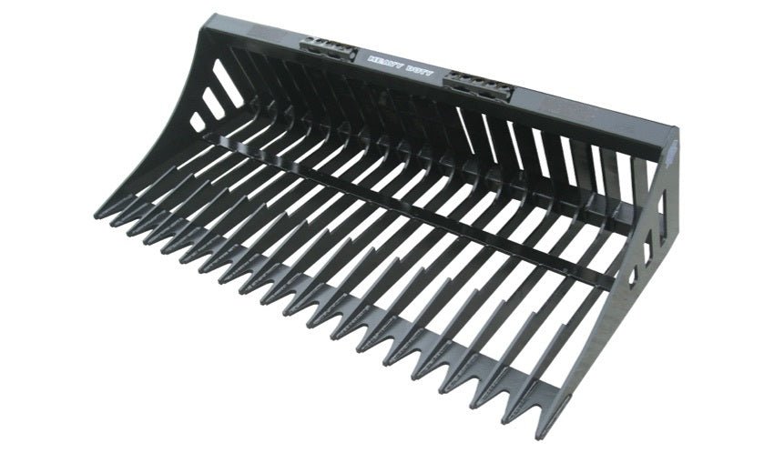 With the increased horsepower and size of many new skid steers and compact track loaders, this rock bucket has become very popular. The 1/2″ tines will stand up to the abuse of the largest machines, and the closed in quick attach area protects the operator by keeping debris from coming back through the quick attach.