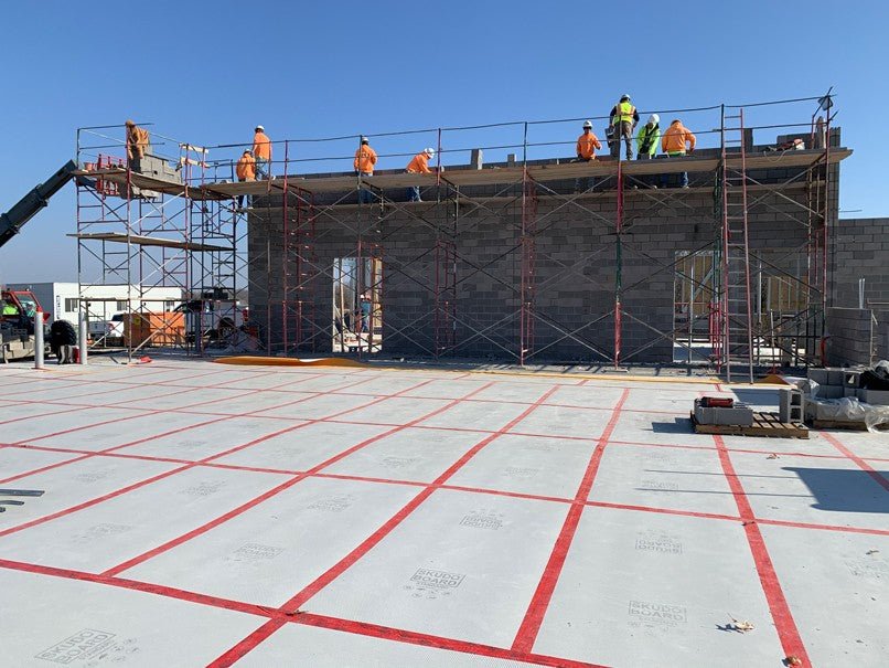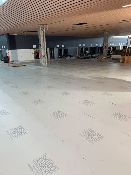 SkudoBoard should not be used on freshly placed concrete unless that concrete will be later covered with another finishing product, such as tile, carpet, LVT, etc. Using SkudoBoard on uncured concrete can lead to curing lines where the boards are joined.