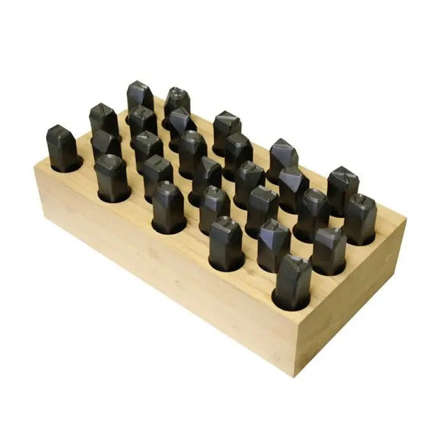 CH Hanson offers a set of Heavy Duty Letter stamps, crafted for hand-held, hammer-struck marking. The Heavy Duty stamps are recommended for moderate industrial applications. The crowned striking surface ensures full force to the center. Each shank is tempered for an extra dose of safety, and the oversized shank delivers more consistent stamp control. This set consists of 27 pieces, with letters A through Z and an ampersand (&).