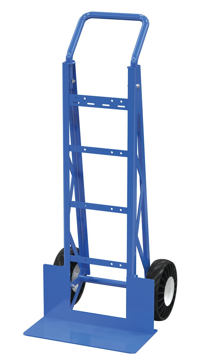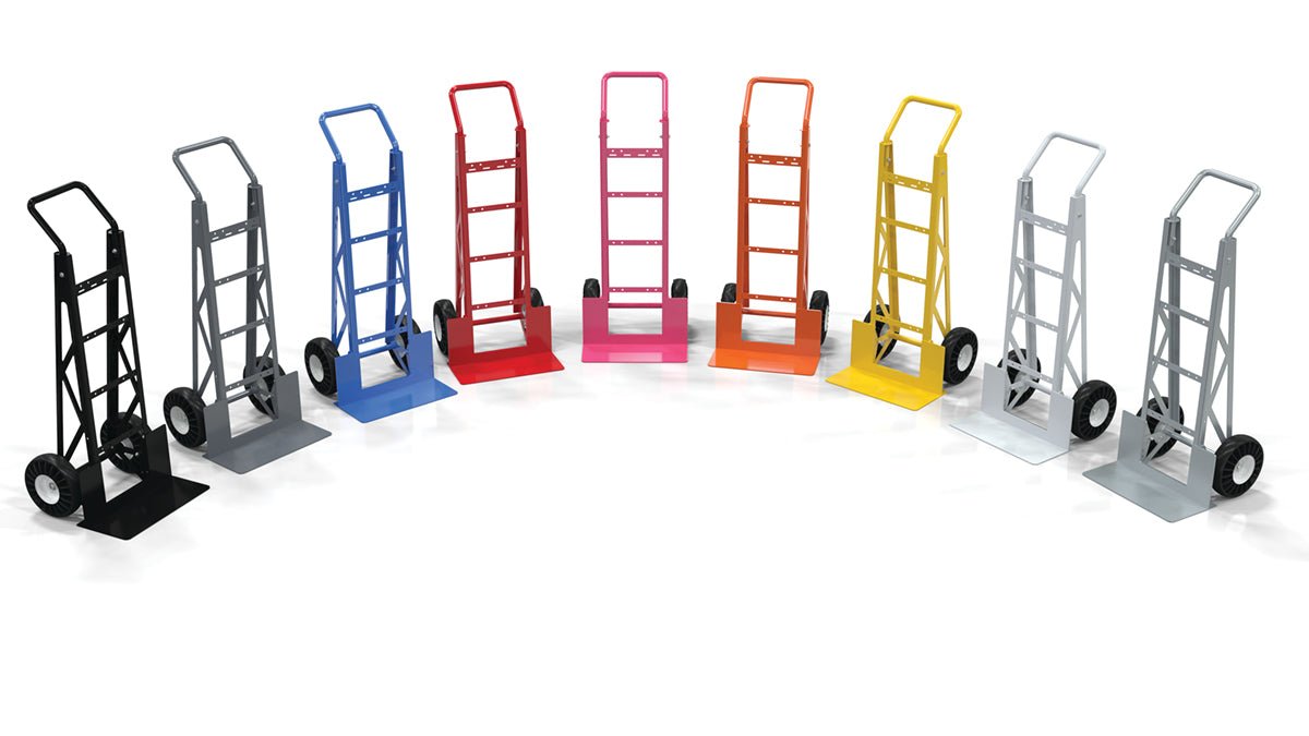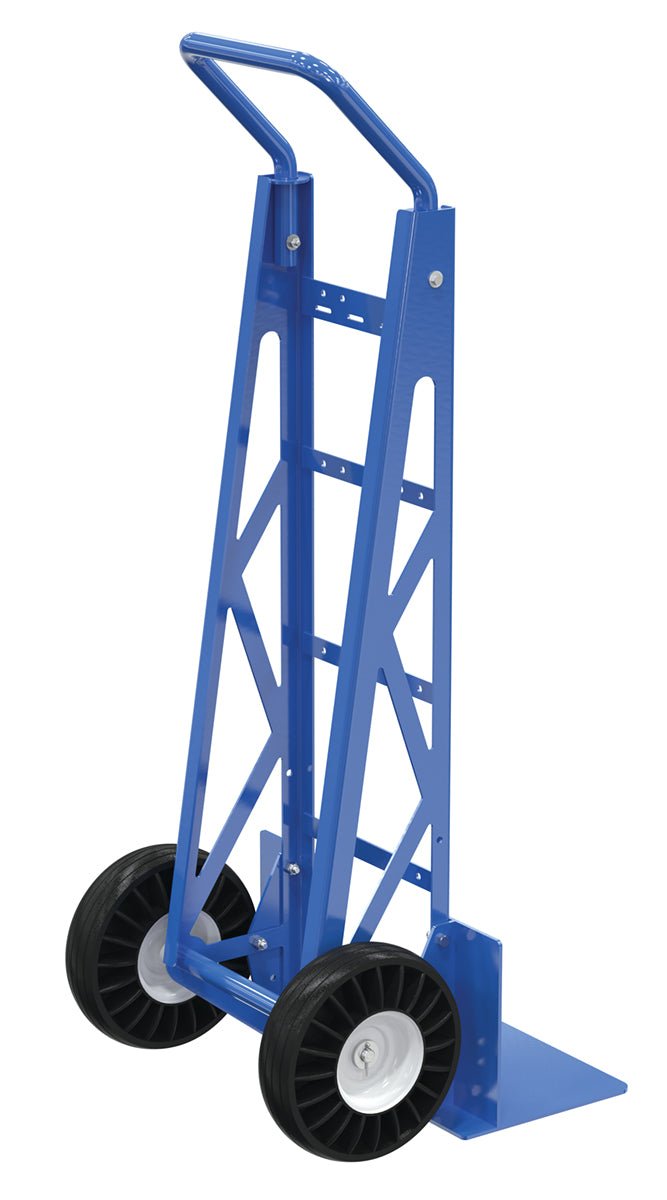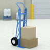 Easy grip handles provide comfort to persons using hand truck. Removable handles conveniently store on back of hand truck when not in use. Steel construction. 10" x 3-1/2" pneumatic wheels.