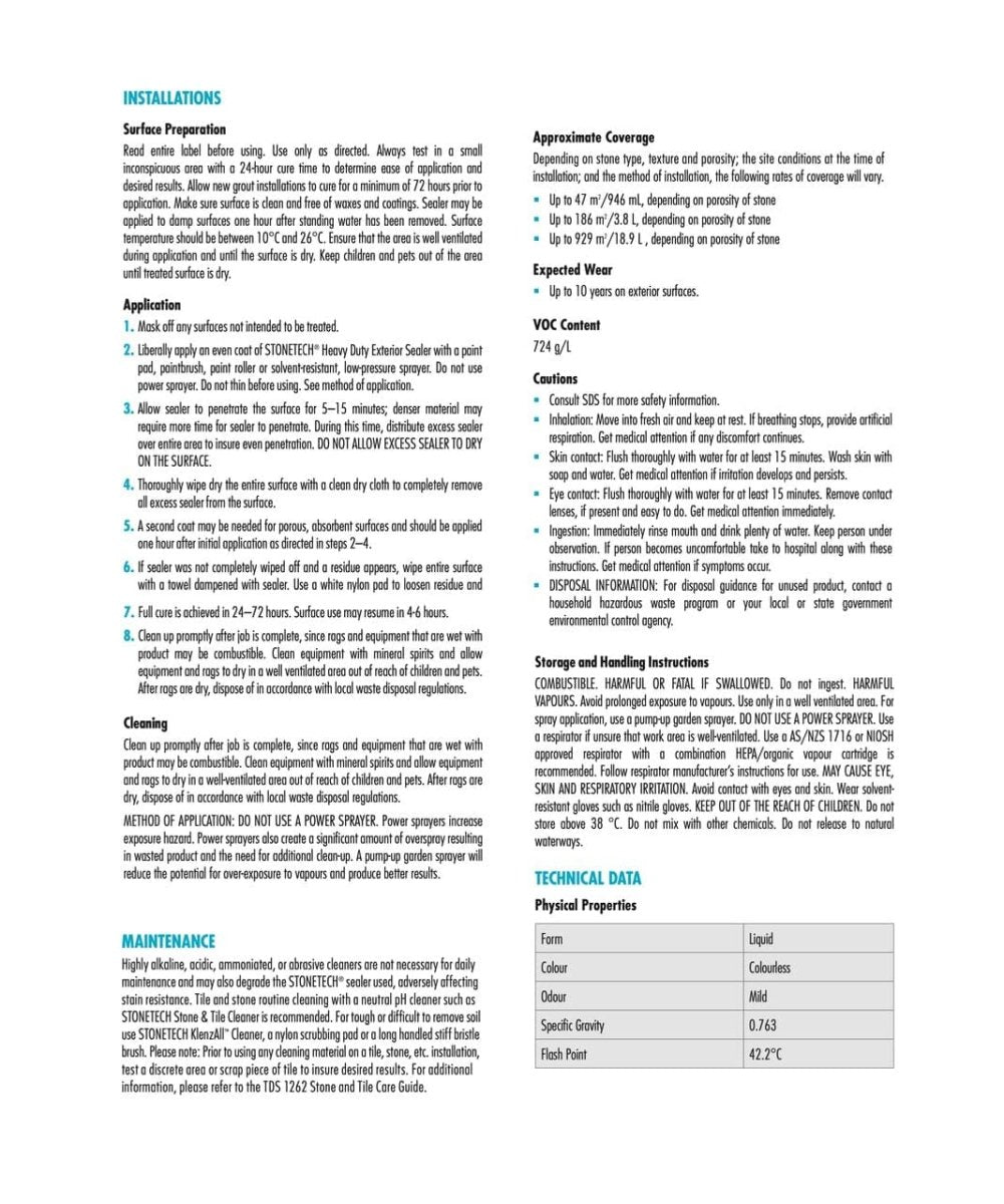 Stonetech Heavy Duty Exterior Sealer formerly made by Dupont is now produced by Laticrete International. The exterior sealer is an outside sealer used as a sandstone sealer, granite sealer, masonry sealer, and more. The sealer can also be used on limestone, granite, grout, sandstone, concrete, brick, pavers, slate, and natural stone. Quart, gallon and 5-gallon bottles are both available.