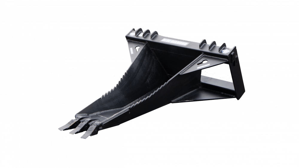 The long profile and curved bottom make quick work out of large stumps and can pry up rocks with ease. It reaches far under the stump and tears the roots with the teeth located on the side of the bucket. Other uses for this skid steer stump bucket include prying up old fence posts, removing sidewalks and asphalt, and digging ditches and swales. Rental Recommended.