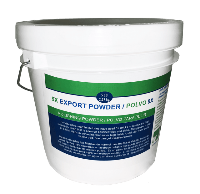 For decades marble factories have used 5X bricks to achieve the high reflectivity finish that is seen on polished marble tiles and slabs. This powder is used as a final step in achieving that super high finish. Used with water and a Gorilla Pad one can get excellent results.